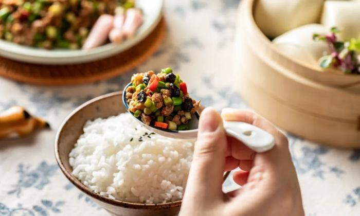 直接上勺子,脆甜的蒜薹丁、幹香的肉末、鹹香的豆豉,辣椒圈也不放過,全都撈到米飯上!