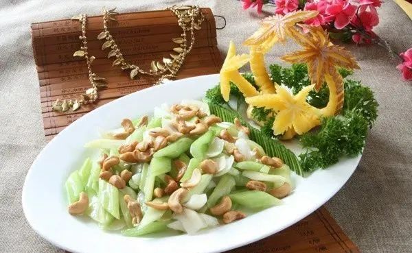 西芹洗淨削皮,切成菱形塊;百合掰開洗淨;腰果用油炸熟備用。