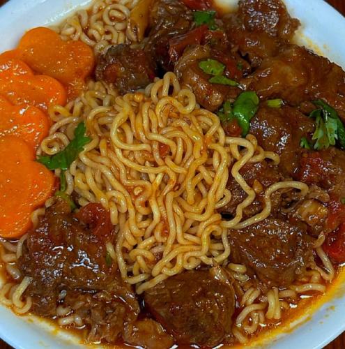 將煮好的麵條撈入碗中,舀上燉好的紅燒牛肉及湯汁,搭配幾塊燉軟的胡蘿蔔和番茄,一碗懶人版紅燒牛肉麵就完成了,大塊牛肉搭配濃郁湯汁,讓人回味無窮。